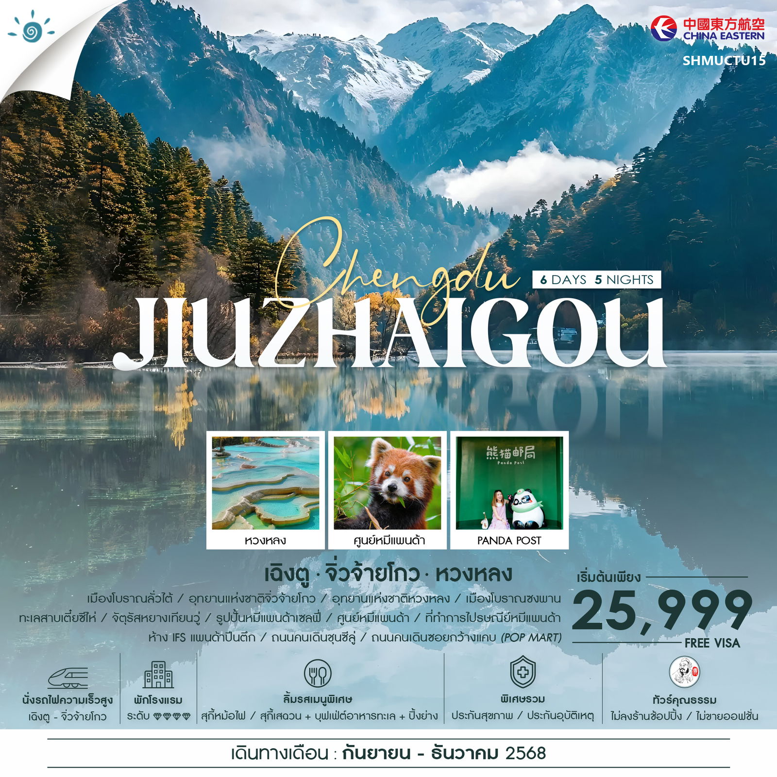 ไฮไลท์ของการท่องเที่ยวทริปนี้ นั่งรถไฟความเร็วสูงก่อนใคร จาก เฉิงตู สู่ จิ่วจ้ายโกว เพียง 2 ชม. อุทยานจิ่วจ้ายโกว มรดกโลกทางธรรมชาติ (รวมรถเวียนในอุทยาน) สัมผัสน้ำใสเรียบเหมือนกระจก สะท้อนภาพท้องฟ้า ภูเขาและต้นไม้ “อุทยานหวงหลง รวมค่ากระเช้าขาขึ้น-ลง+รถกอล์ฟ” แลนด์มาร์ก SO CUTE !! PANDA POST จุดต๋าข่า..ตึก IFS ถ่ายรูปใกล้ชิดน้องแพนด้าปีนตึก ชมความน่ารักของ หมีแพนด้า ต้นกำเนิดในมณฑลเสฉวน ช้อปปิ้งแสนฟินกับ ซอยกว้างเเคบ (POP MART,52 TOYS)